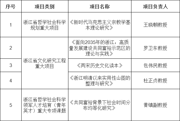 近日,省哲学社会科学工作办发布了多类项目立项公示名单。我校王晓朝教授喜获省哲学社会科学规划重大项目立项,罗卫东教授、包伟民教授、杜正贞教授喜获省文化研究工程重大项目立项,黄镇副教授喜获省哲学社会科学领军人才培育(青年英才)重大专项课题立项。其中省哲学社会科学规划重大项目是近年来我校首次获得立项,标志着我校哲学社会科学研究水平经过不懈努力取得了历史性突破!