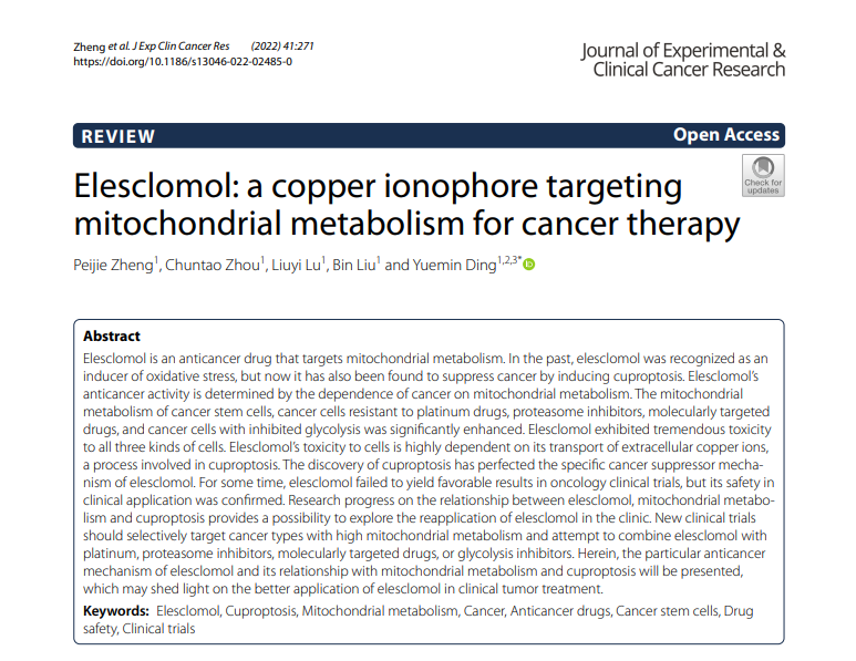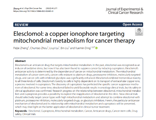 铜死亡(Cuproptosis)是今年3月份哈佛-MIT博德研究所学者报道的一种最新的细胞死亡方式,具有极其重要的生物学意义,一经提出即成为生物医学领域的研究热点。郑佩杰团队在与导师商讨之后,迅速跟进,敏锐地发现了Elesclomol这一铜离子转运体,它可将细胞外铜离子转运到细胞中来诱导铜死亡的发生。Elesclomol 过去曾被认为是一种诱导氧化应激的抗癌剂,基于其对Cuproptosis的诱导作用的最新发现,为研究Elesclomol的新型抗癌机制和进一步拓展其临床抗癌应用提供了基础。本论文详细介绍Elesclomol靶向线粒体代谢的机制,高度依赖线粒体代谢的癌细胞对Elesclomol极为敏感,包括癌症干细胞、化疗耐药细胞和低糖酵解细胞。本文还总结了Elesclomol的具体抗癌机制,最后对Elesclomol的临床应用前景进行了展望。