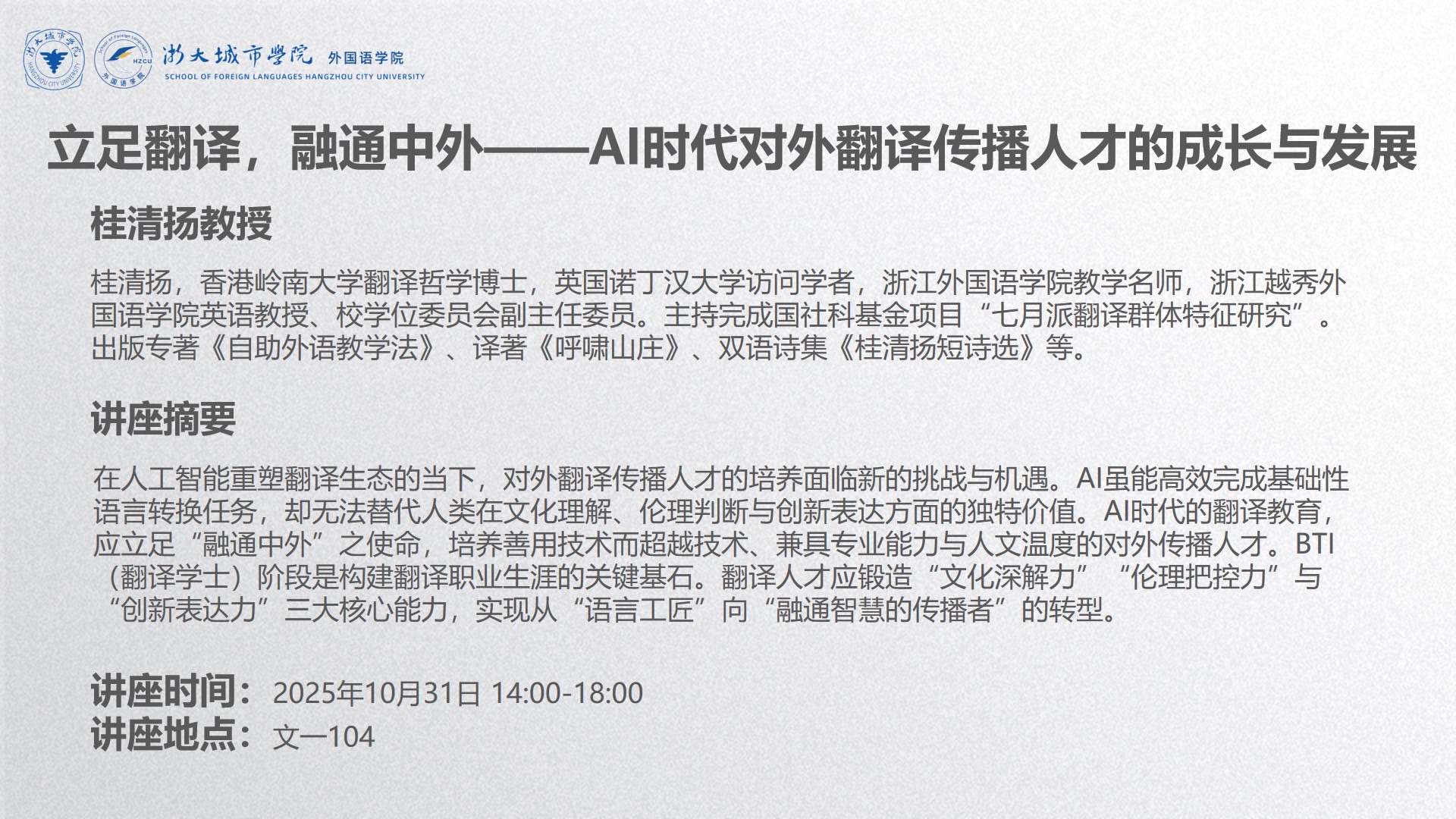 讲座立足翻译,融通中外——AI时代对外翻译传播人才的成长与 讲座标题 发展时间:2025-10-31 14:00